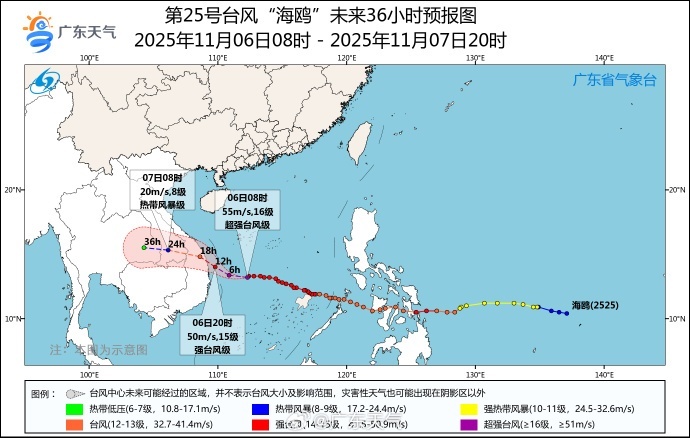 预计,“海鸥”将以25~30公里的时速向西偏北方向移动,将于6日夜间以台风级或强台风级(13~14级)在越南中部一带沿海登陆,之后强度逐渐减弱。过程期间其中心距离我省(徐闻)最近约600公里(距离广州约1100公里),对我省陆地和近海无直接影响。